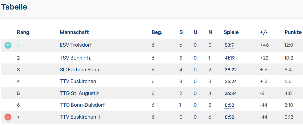 Das Spiel gegen den TTV Euskirchen wurde ebenfalls verlegt. Das Spiel findet am 28.11.25 um 18:00 Uhr in Euskirchen statt. Die zweite des TTV belegt aktuell, nach drei sieglosen Spielen den sechsten Platz in der Liga.